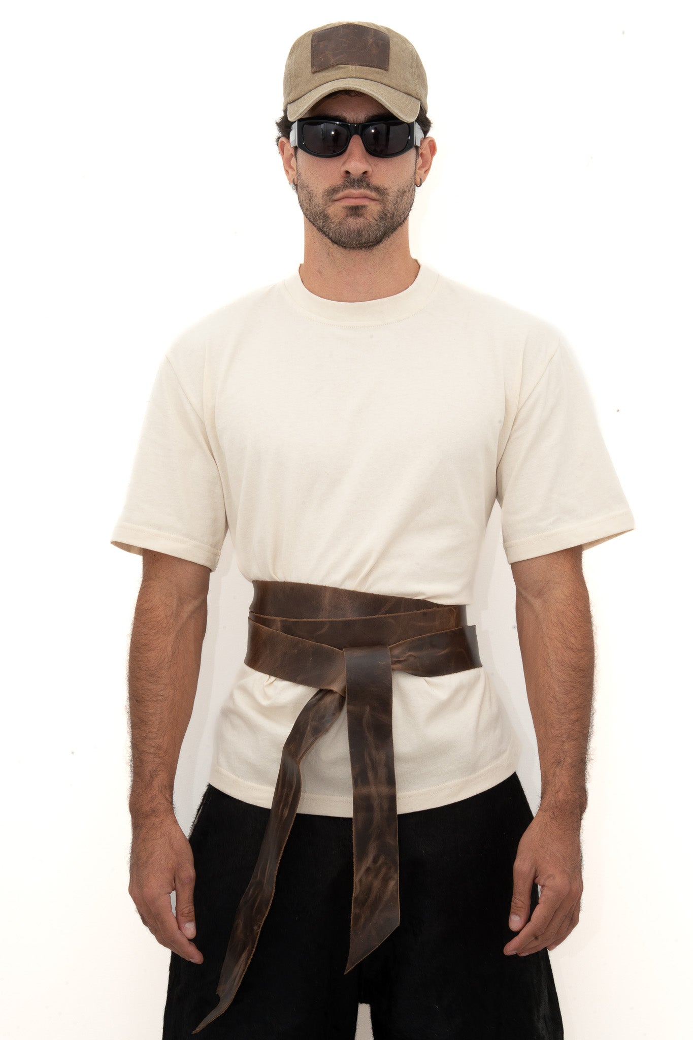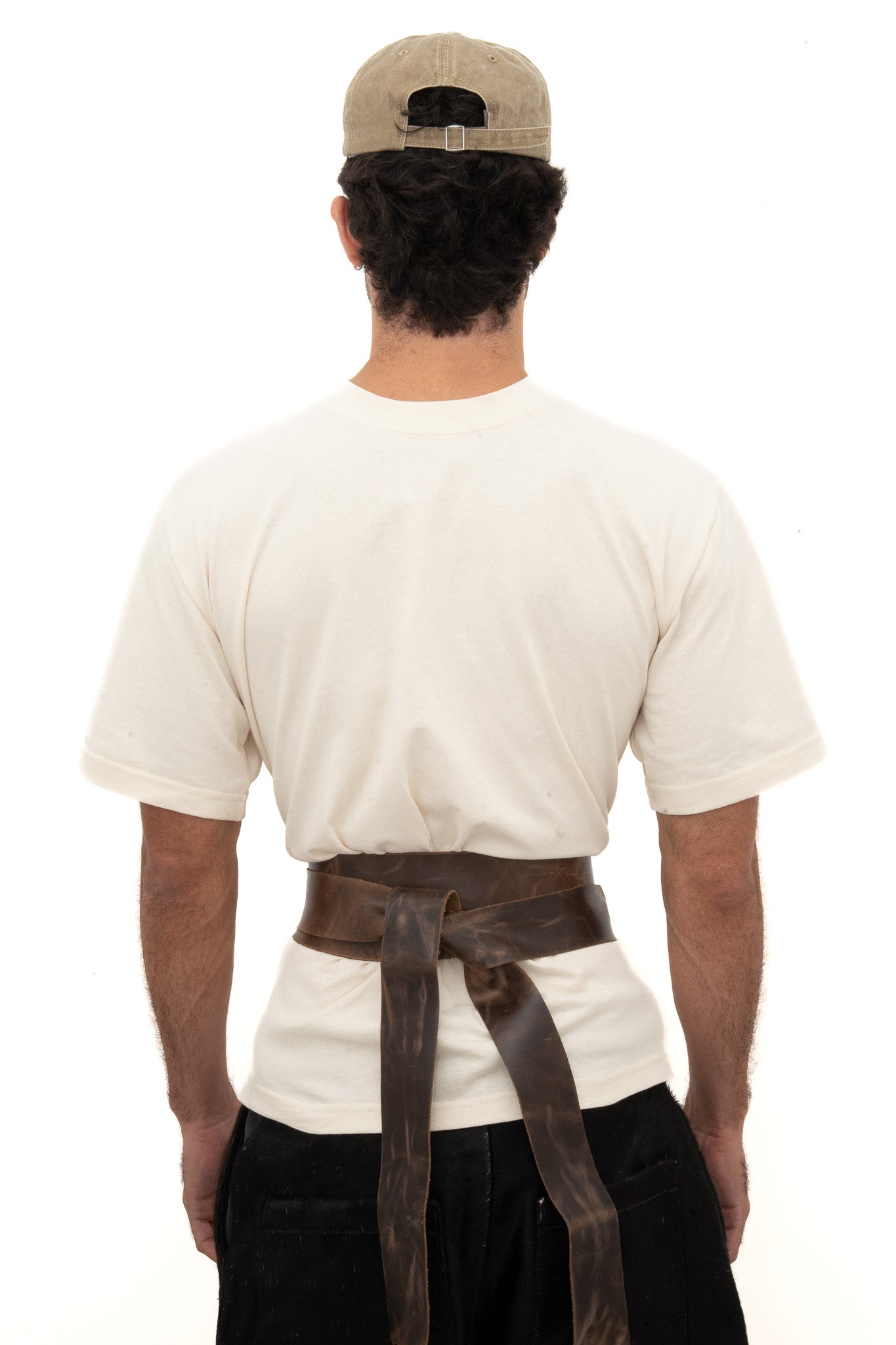 Made from 100% cotton with adjustable leather straps that wrap and tie around the waist. The straps are cut from ethically sourced leather, giving each piece a slightly different texture and tone.