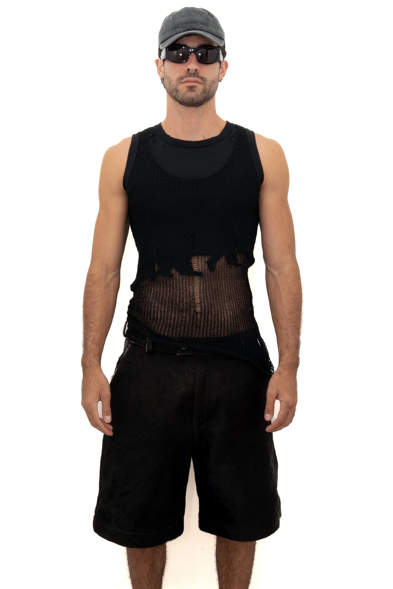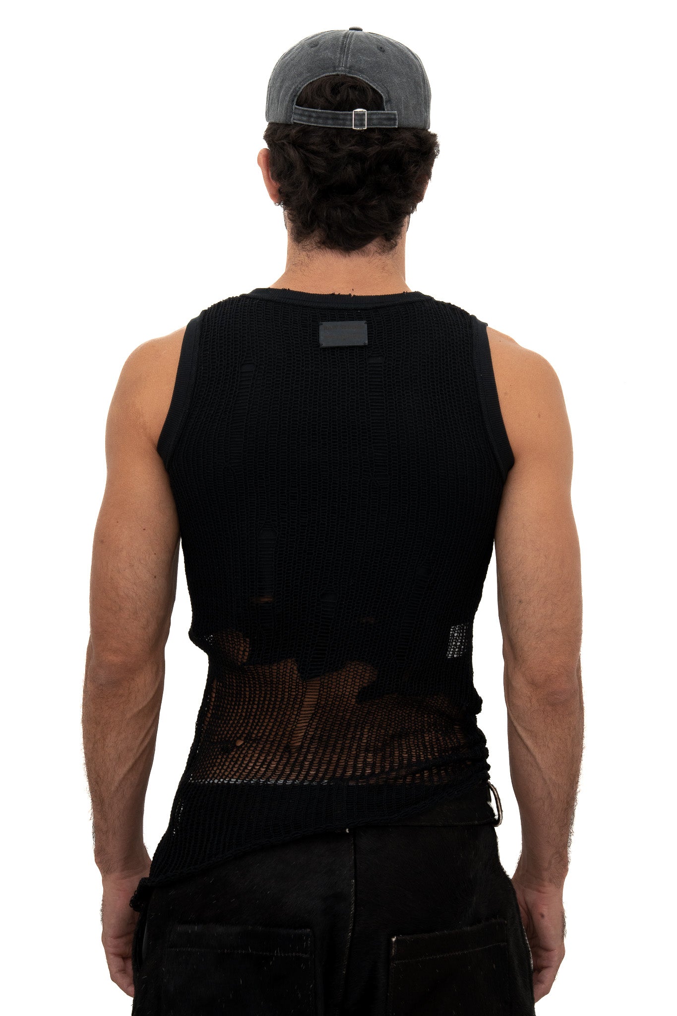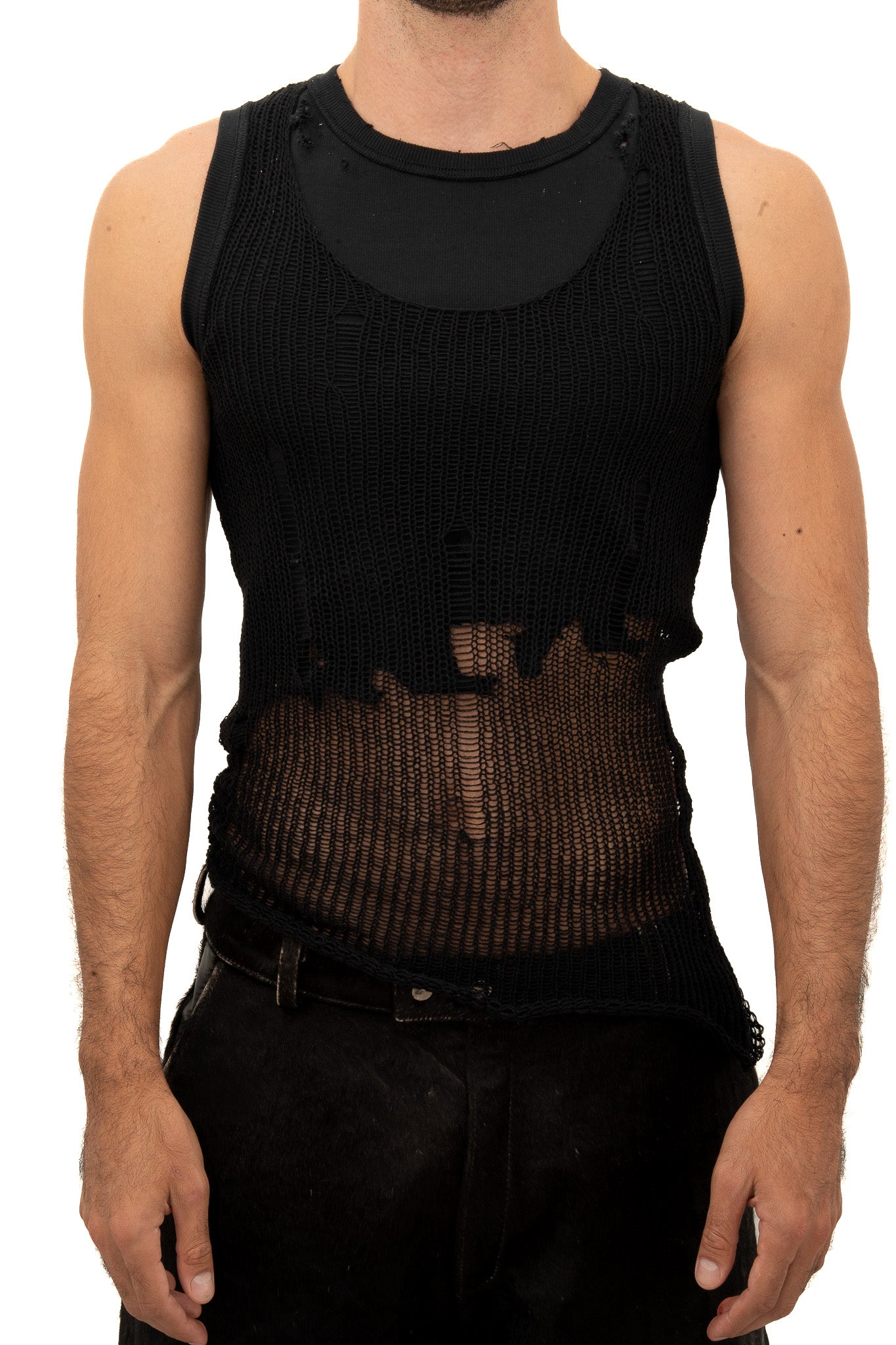 A double-layer tank made from organic and recycled cotton. The inner layer is soft and fitted, while the outer knit has an open, distressed texture that reveals what’s underneath.