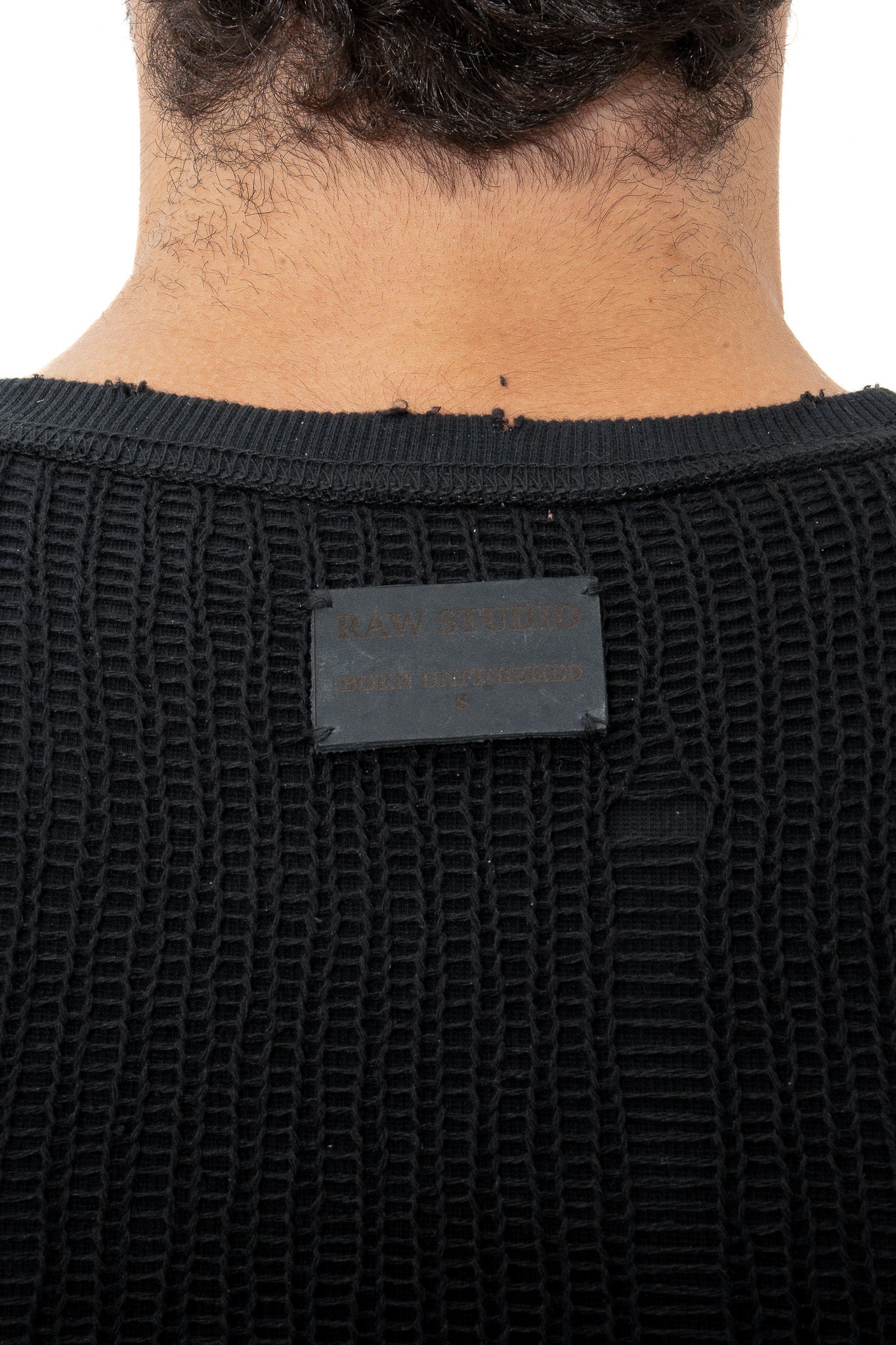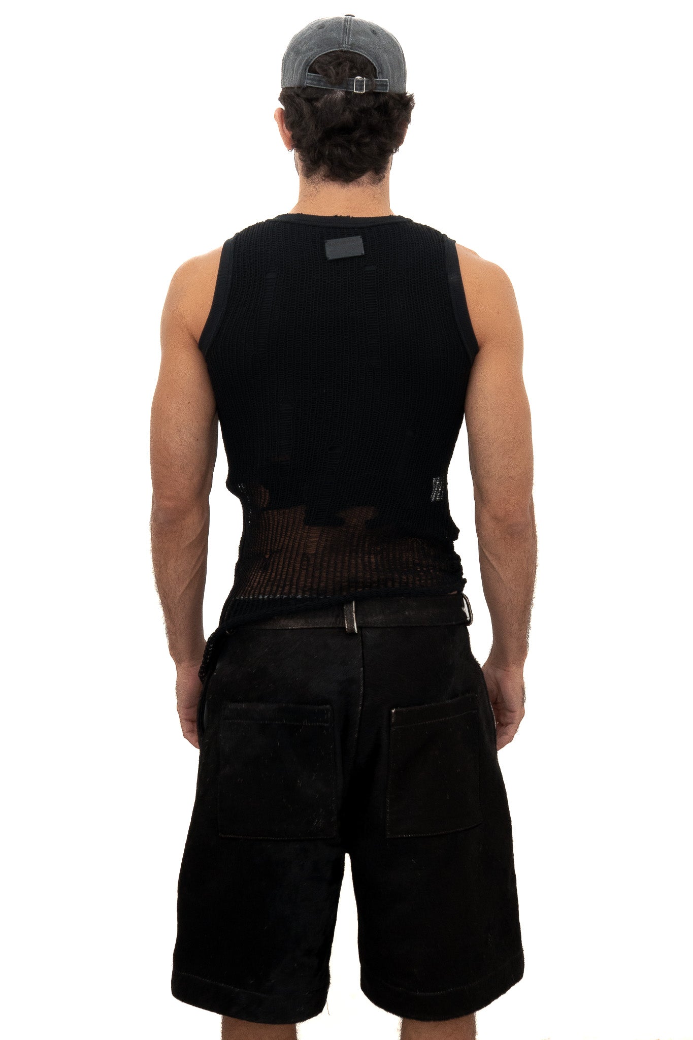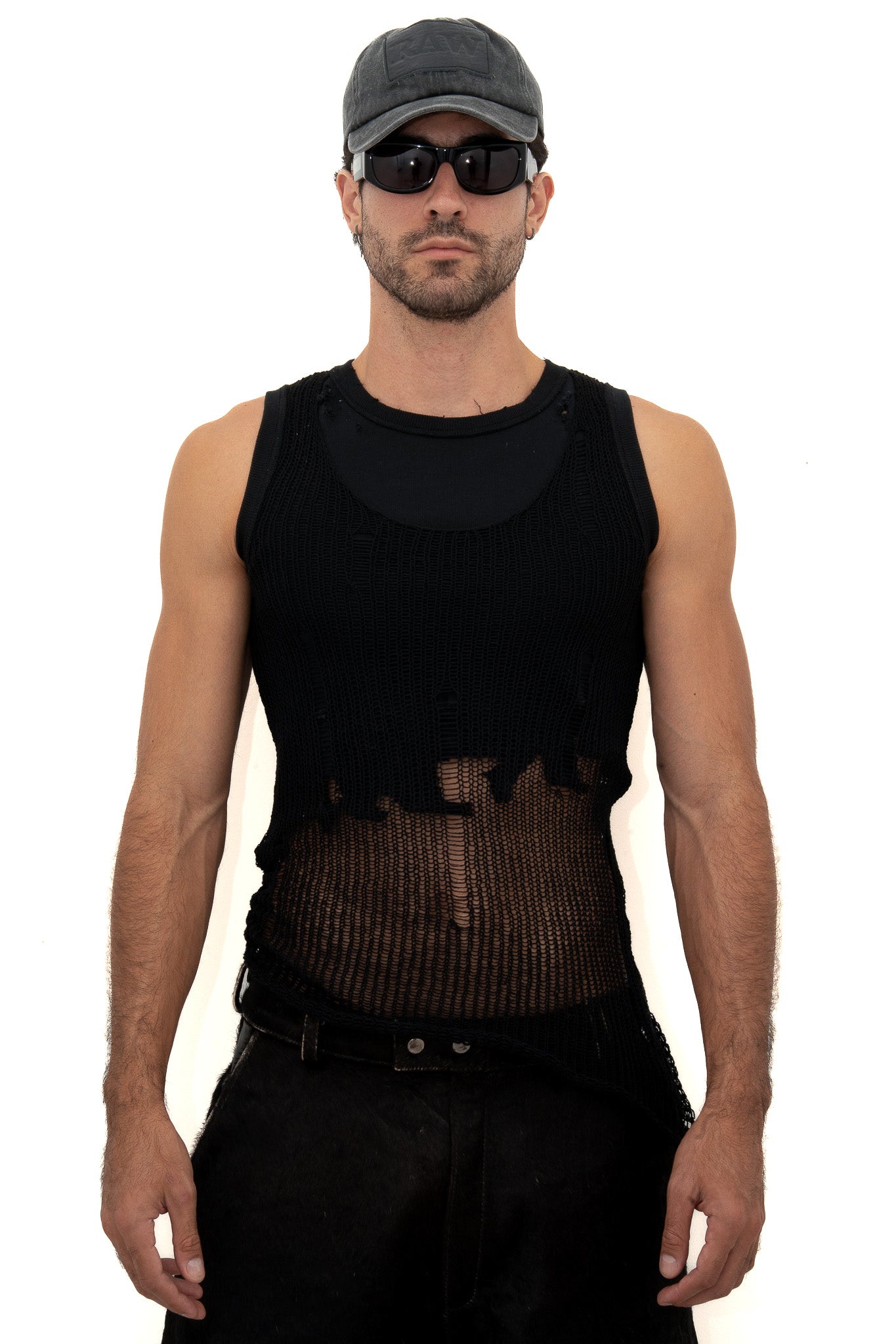 A double-layer tank made from organic and recycled cotton. The inner layer is soft and fitted, while the outer knit has an open, distressed texture that reveals what’s underneath.